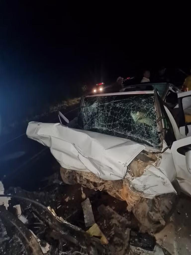 O acidente foi registrado por volta das 17h30. De acordo com a Polícia Rodoviária Federal (PRF), os veículos trafegavam em direções opostas quando o carro de passeio invadiu a contramão e colidiu frontalmente com a picape. Com o impacto, a frente dos dois veículos ficou totalmente destruída.