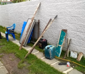 Entre os itens recolhidos estão pedaços de madeira, galões, uma garrafa de bebida alcoólica e um chinelo.
